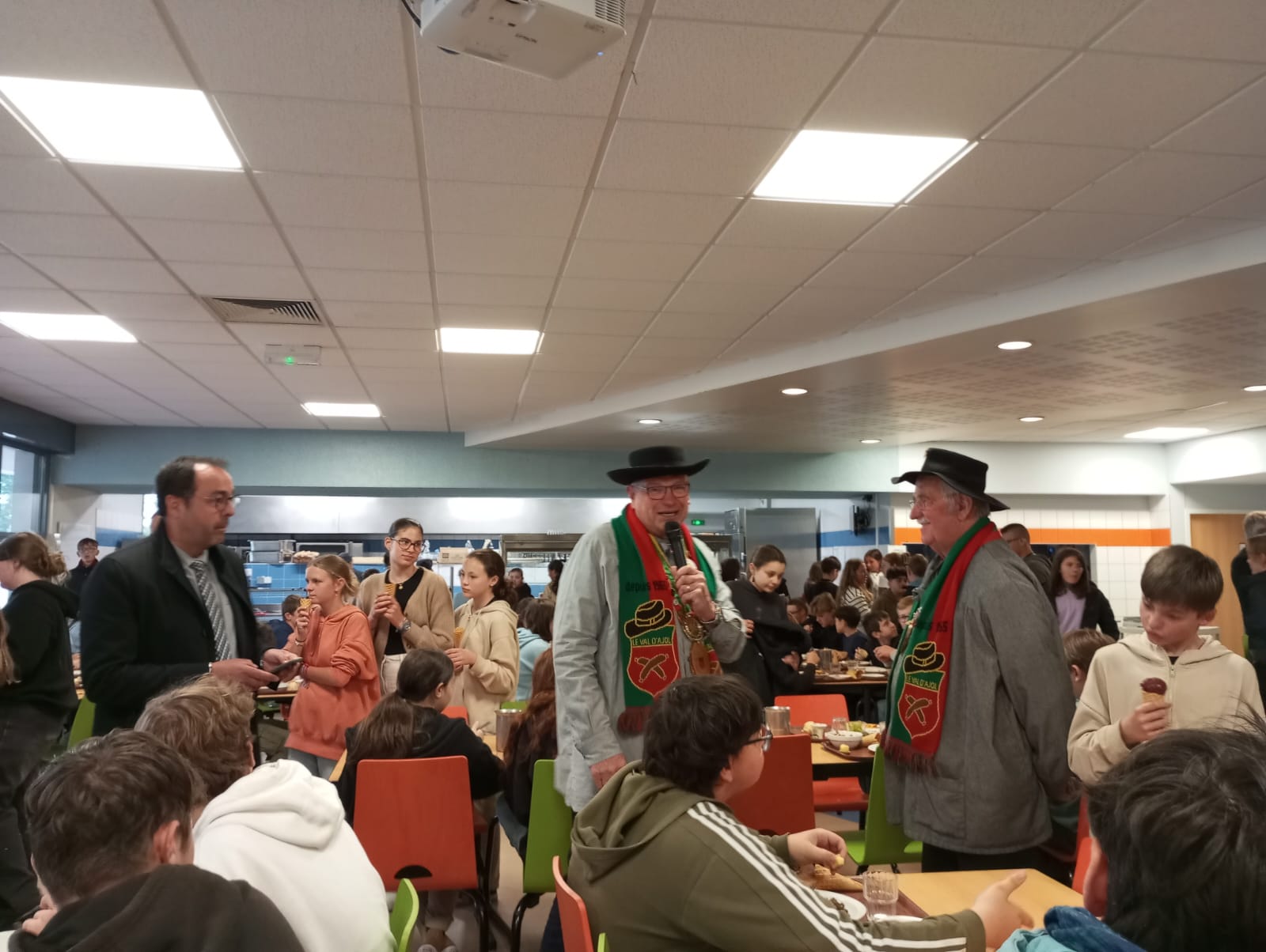 Le 22/05 – Gérard et Philippe ont présenté la Confrérie et l’andouille lors d’un déjeuner agri-local au Collège de Plombières