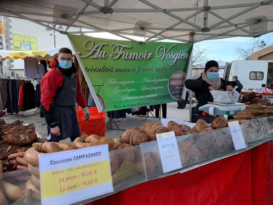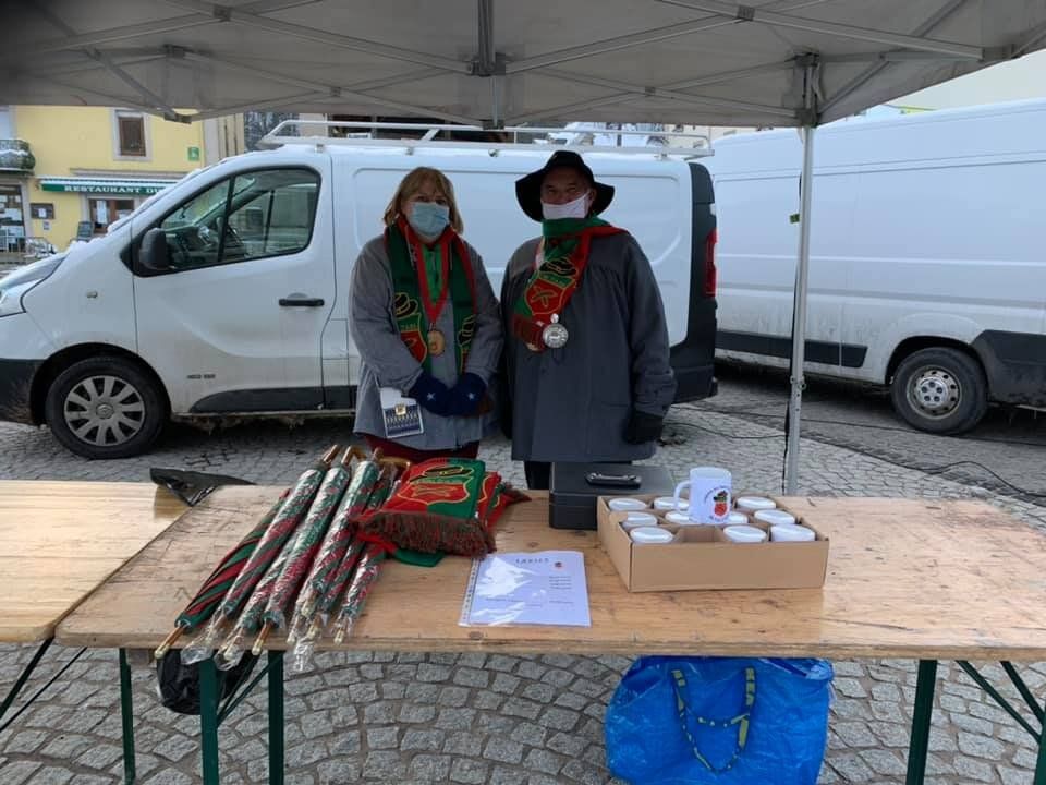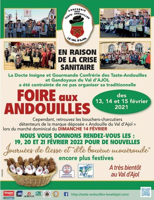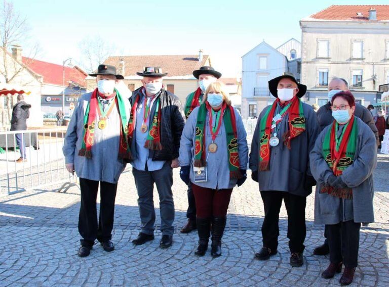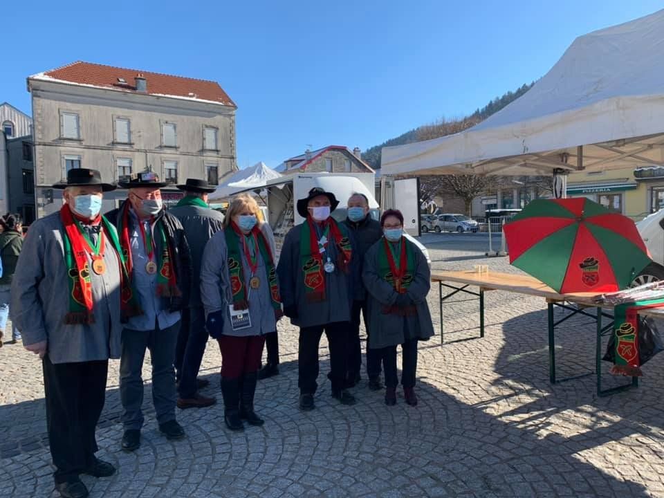 La traditionnelle foire aux Andouilles n’a pas pu avoir lieu en 2021 et c’est la mort dans l’âme que nous avons du annuler les trois jours de liesse habituels. En accord avec la municipalité, les bouchers détenteurs de la marques et les producteurs locaux (habitués des Sites Remarquables du Goût ) ont pu s’installer sur le marché dominical du 14 février. Quelques membres de la Confrérie étaient présents également afin de marquer l’évènement.